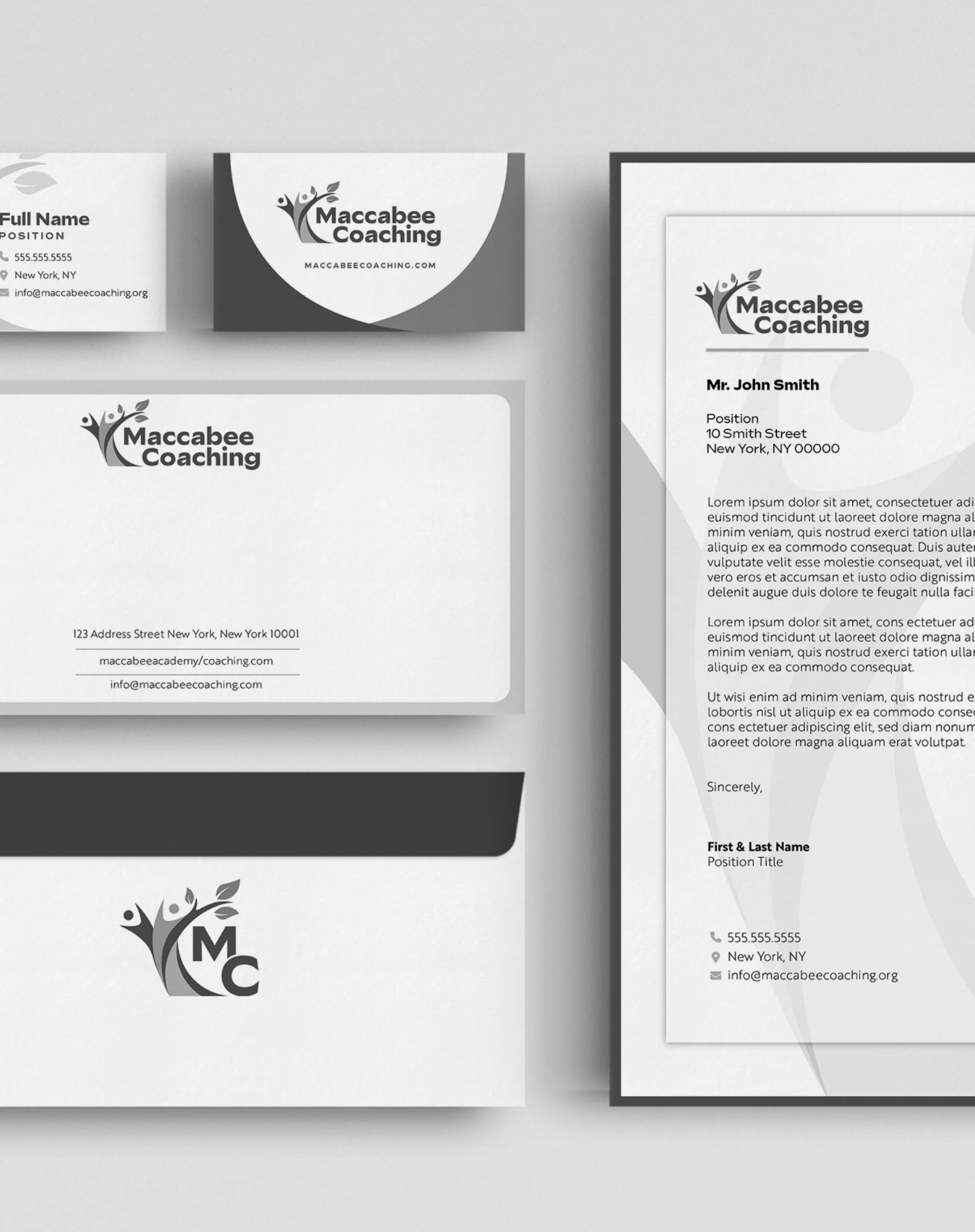 A clean, approachable brand identity system that connects Maccabee Coaching to its Academy roots while establishing its own professional presence.